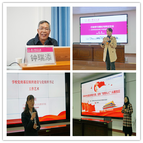 在培训中,广西师范大学马克思主义学院二级教授钟瑞添、国际文化教育学院党委书记刘月娥、政治与公共管理学院社会学与社会工作系教工支部书记蔡慧玲分别就党史学习教育、基层党组织建设、党组织书记领导力提升、发挥“双带头人”头雁效应、样板党支部创建等作专题辅导报告,环境与资源学院办公室主任练琪以行动学习法讲授党员发展工作如何抓实抓细抓规范。培训班学员还赴广西师范大学教育学部、文学院党建示范点进行了现场参观学习。