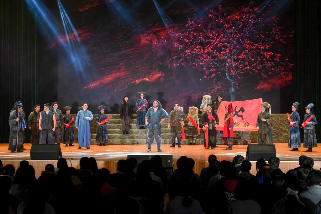 11月8日晚,壮剧《百色起义》在pg娱乐文化艺术中心上演。学校党委书记李振秋、校长冯昌信、党委副书记王汉奇,教师和学生代表观看演出,在生动而具有民族艺术特色的舞台表演中重温革命历史,感受红色精神。