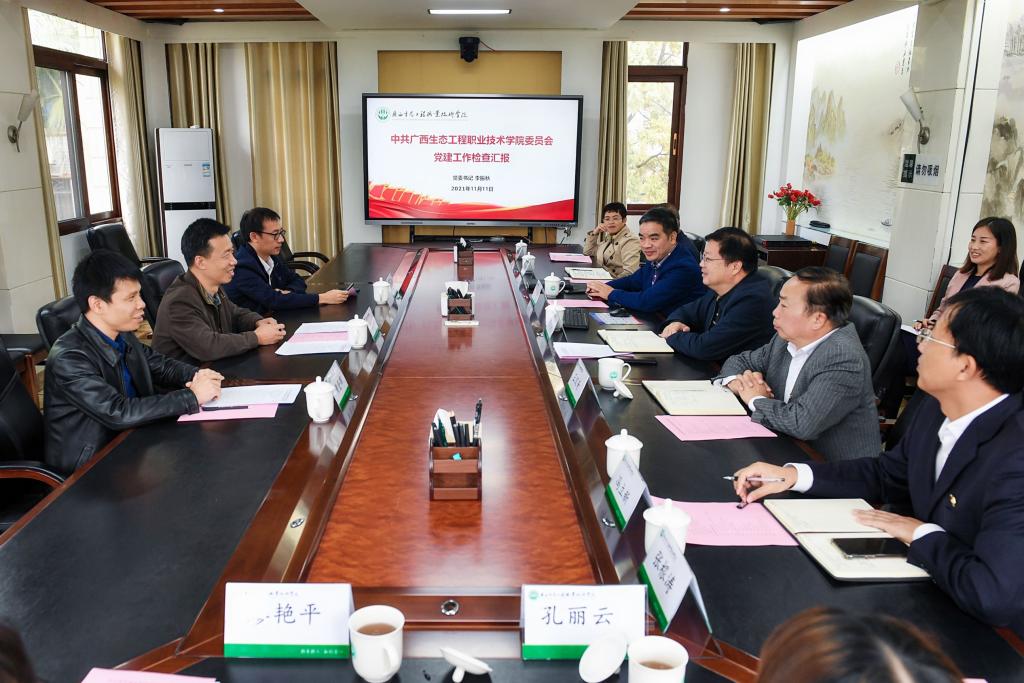 李振秋代表学校党委就学校党建工作基本情况、主要成效、存在问题和下一步整改措施等几个方面进行了汇报。学校党委严格落实全面从严治党战略部署,扎实推进基层党组织标准化规范化建设,做到了党总支“组织员”100%全覆盖,教师党支部“双带头人”100%全覆盖。目前,学校有全国党建样板支部1个,首批新时代广西高校党建工作样板支部1个,建成自治区级五星党支部7个、四星党支部7个、三星党支部3个,占比57%。同时,学校在党史学习教育中认真开展“我为群众办实事”活动,先后解决教师入编、校园亮化美化、食堂及后勤服务社会化、乡村振兴技术服务等多项问题,进一步助推党的建设,深入贯彻落实新时代党的组织路线。