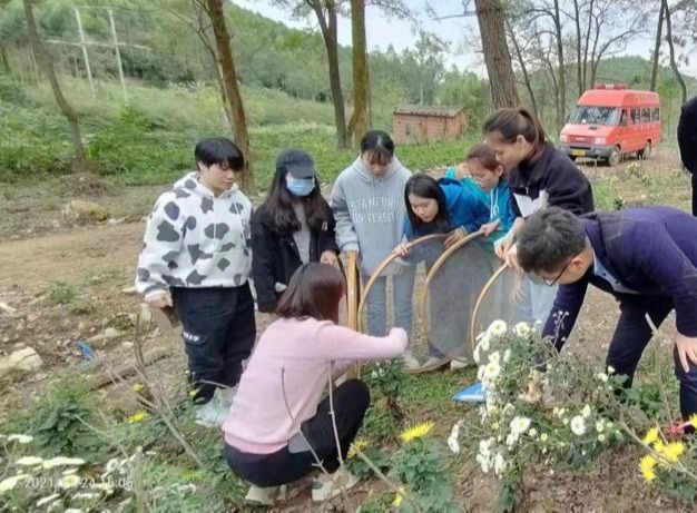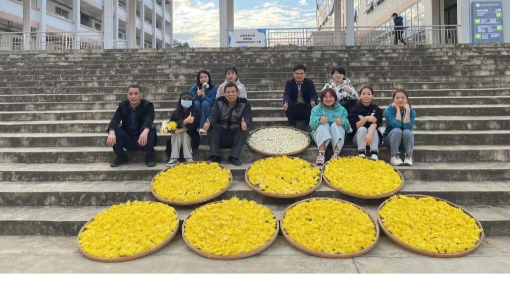 pg娱乐参加实习锻炼的旅游与交通学院学生在采摘金丝皇菊
