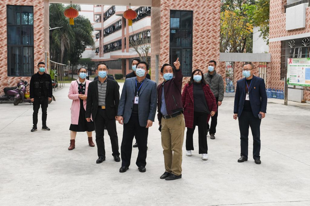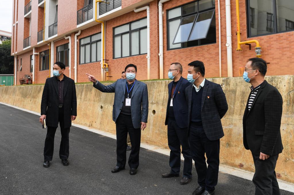 李振秋(前排左)在学生公寓检查疫情防控工作