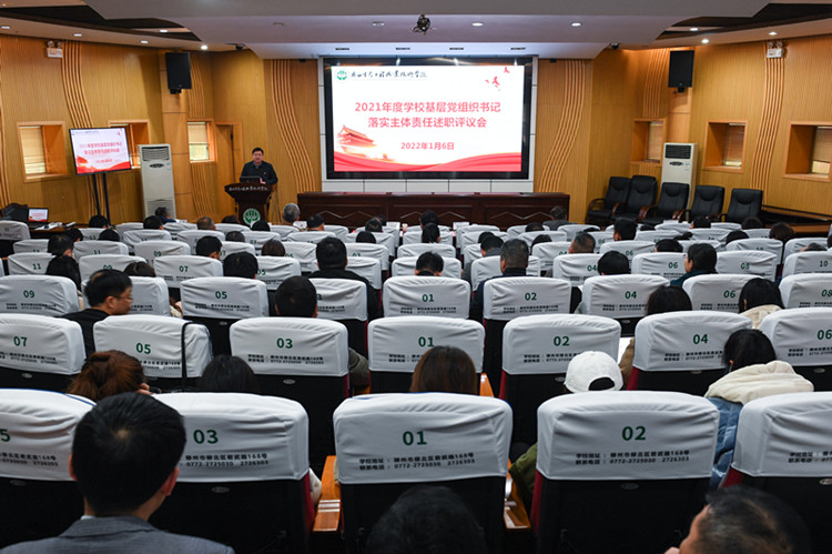 1月6日,学校党委召开了2021年度基层党组织书记落实主体责任述职评议会。学校领导班子成员、各党(总)支部书记、支委、相关职能部门全体人员共计180余人参加会议。学校党委书记李振秋出席会议并讲话。会议由学校党委副书记王汉奇主持。