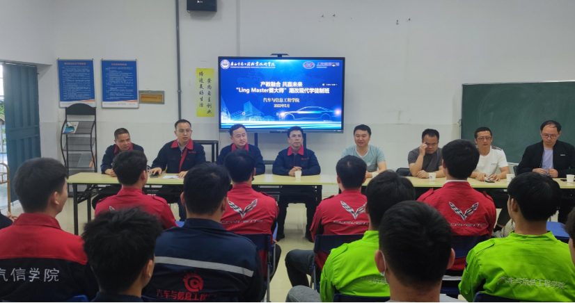 2022年5月16日下午,pg娱乐电子游戏官网入口汽车与信息工程学院与上汽通用五菱有限公司在汽车实训基地举行“Ling Master菱大师”潮改现代学徒制班开班仪式,上汽通用五菱汽车有限公司售后服务部经理谭作乐、售后服务部主管李京雷等5人以及pg娱乐电子游戏官网入口副院长杨萃洁、邓剑锋和汽车专业教师代表和“潮改班”学员参加了开班仪式。