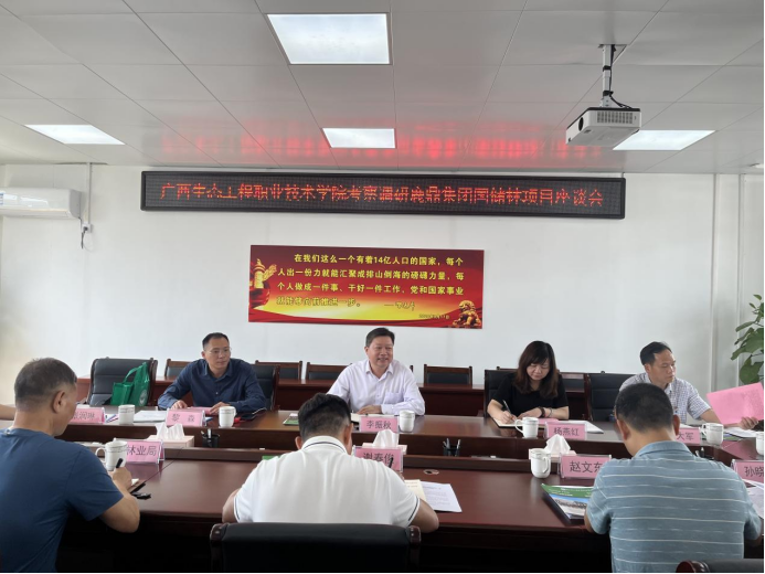 参观走访后,李振秋书记一行前往广西鹿鼎林业集团进行座谈交流,广西鹿鼎林业集团董事长谢春俊介绍了广西鹿鼎林业集团场县合作模式及国储林建设在品牌运营、员工培养、员工福利等方面的基本情况。李振秋书记介绍了学校基本情况,回顾了学校与鹿鼎林业集团的合作历史,并就今后在加强人才培养、双师建设、实习就业、产业学院等多方面合作表达了意愿和想法。学校副校长杨燕红介绍了pg娱乐2022届毕业生情况,解读了学校就业政策和校招方案。谢春俊总结分析了企业用人现状、人才需求及行业发展趋势,表达了强烈的校企合作意愿。今后,学校将持续深化校企合作,着力提高技术人才培养与行业企业需求的契合度,为绿色家居产业发展提供坚实的人才保障。