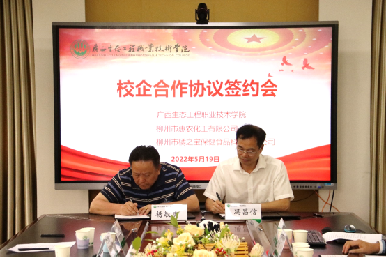 最后,冯昌信校长和柳州市惠农化工有限公司、柳州市橘之宝保健食品科技有限公司的领导分别签署了校企合作协议,并举行了“pg娱乐电子游戏官网入口教师工作站”授牌仪式。