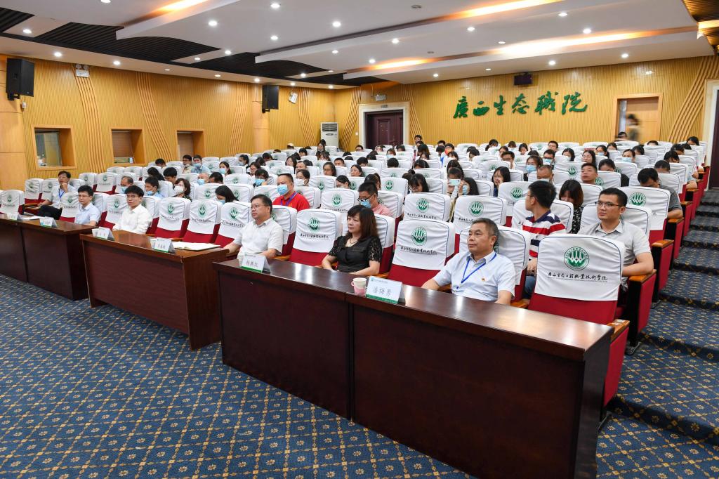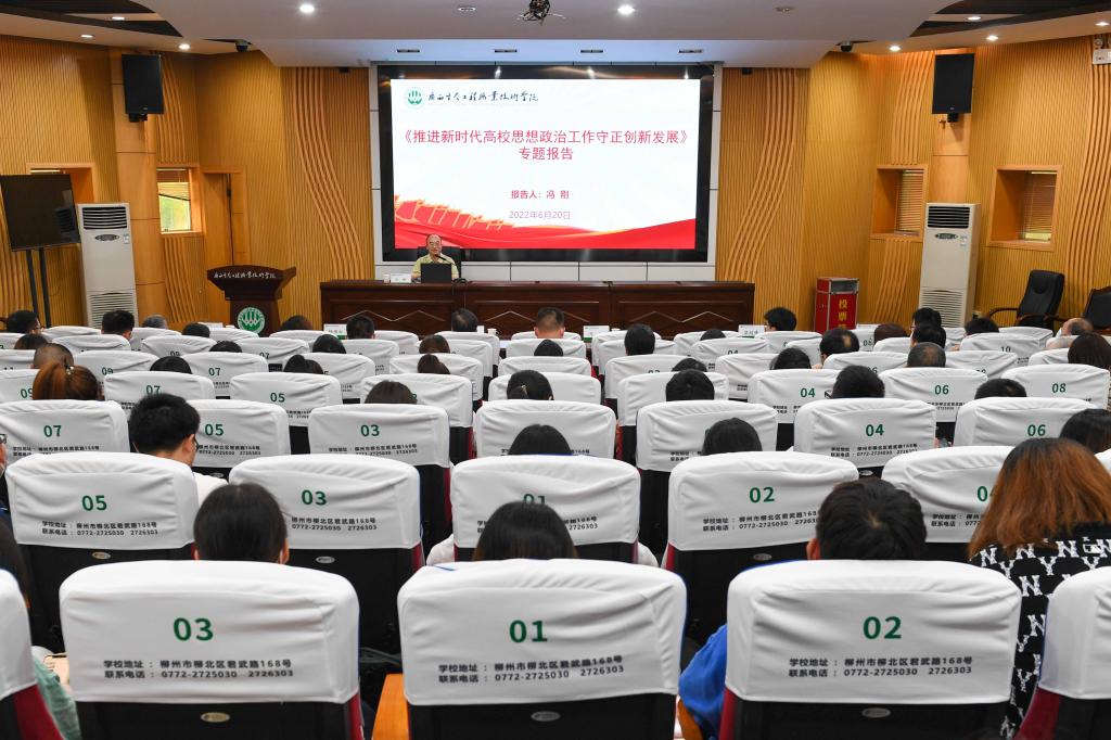 副校长杨燕红、潘梅勇,党委宣传部、学生工作处、校团委、马克思主义学院全体人员,以及二级学院书记、副书记、团委书记、学工科科长、全体辅导员等共计100余人现场聆听了报告会。
