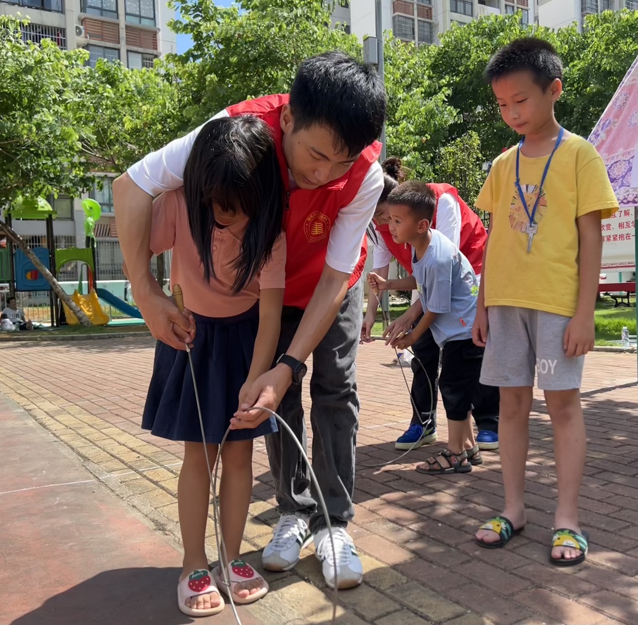 民族体育运动是各民族在历史的长河中创造、积累和发展起来,是深入推进民族团结进步的桥梁。7月11日上午,民族体育活动在主持人陈香老师的组织带领下有序进行,志愿者们组织老乡家园的小朋友们到操场进行相互认识,为小朋友介绍我们的团队以及本次民族体育活动的内容。各位小朋友积极参与到“抛绣球”、“滚铁环”、“快乐接力”等活动当中,做为志愿者的大学生们手把手教孩子们玩起来,孩子们从不会到熟练掌握体育器材,在欢声笑语中体验着民族体育的魅力,在身体力行中体验、传承民族体育文化。