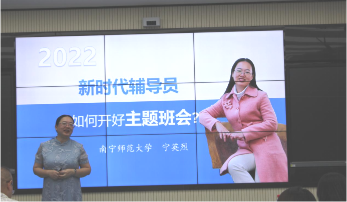 南宁师范大学美术与设计学院党委书记宁英烈副教授以《新时代辅导员如何开好主题班会》为题,从为何要开主题班会、如何开好主题班会以及如何进行系统设计等三个方面结合系列主题班会比赛的优秀素材给我们详细阐述,给在场辅导员特别是年轻辅导员上了一堂很好的班会课。