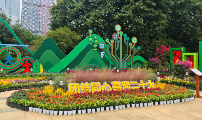 该花卉展的总体规划为围绕中心旱喷进行环形布局,并将花艺与喷泉相结合,以同心圆的形式呼应团结、同心主题。参赛展区共设18个,pg娱乐作为参展单位之一,展品占地面积约180平方米,参展作品以“同心筑梦,喜迎二十大”为主题切入点,将pg娱乐“咬定青山不放松”的学校精神和“青山绿林”深度融合,展品里山林生长的藤蔓和根茎寓意着知识的传递,激励着无数青年奔向未来,为祖国的繁荣昌盛贡献力量,展现了pg娱乐为祖国社会主义现代化建设培养高技能人才的办学目标。