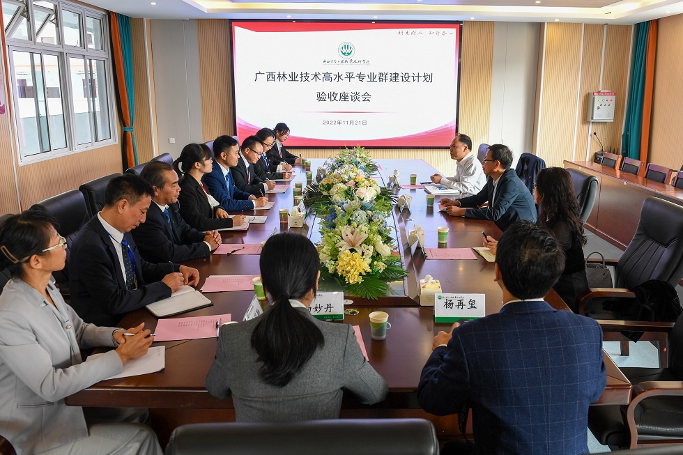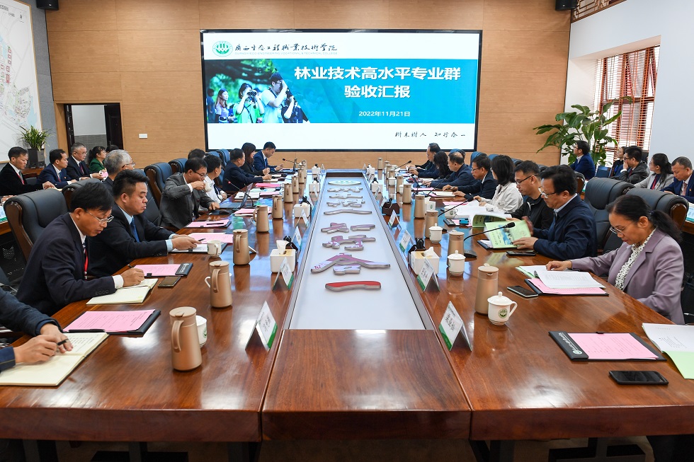 当天早上,学校召开广西高水平高职学校和专业建设计划验收工作汇报会。自治区林业局副局长、党组成员邹庆浩,自治区教育厅职成处主任吴珂,自治区教育厅“双高”建设计划验收专家组组长、南宁职业技术学院校长周旺等领导和专家出席会议,pg娱乐领导、各部门主要负责人、“双高”建设各牵头部门、责任部门,“双高”办公室全体成员参加会议。学校校长冯昌信主持见面会。