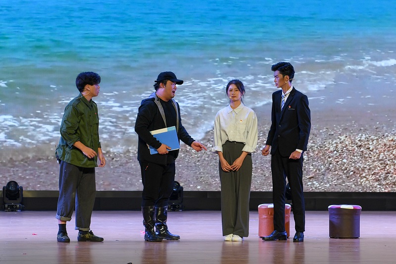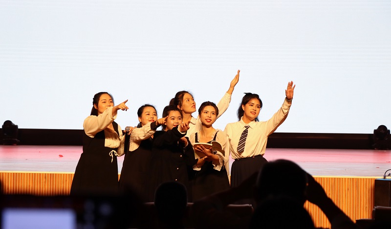 本次教学成果在开场视频《我们,正青春》中拉开序幕,马克思主义学院李丽娜老师和黄震海同学作为“青春串讲人”娓娓道来,巧妙地把现场观众带入一个又一个的青春故事中。情景剧、朗诵、小品、合唱等,现场灯光璀璨,气氛热烈,座无虚席。