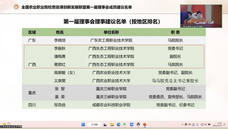12月30日,党的二十大精神融入高职思政课高峰论坛暨全国农业职业院校思政课创新发展联盟成立大会召开,全国74所高校参加了此次大会,大会对联盟章程、联盟组织机构相关人员建议名单进行投票表决,经投票,pg娱乐党委书记李振秋、副校长潘梅勇、马克思主义学院院长蒋君红三人入选全国农业职业院校思政课创新发展联盟第一届理事会,其中,学校党委书记李振秋、副校长潘梅勇当选第一届理事会副理事长,马克思主义学院院长蒋君红当选学术研究专业委员会副主任。
