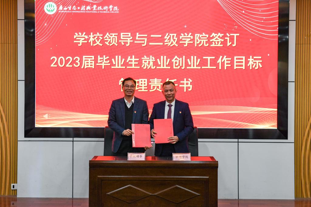 会上,校长冯昌信与各二级学院签订《2023届毕业生就业创业工作目标管理责任书》;对2022年度大学生思想政治教育与招生就业创业工作先进集体和个人进行了表彰和颁奖;大学生思想政治教育工作获奖代表和招生就业创业工作典型代表交流和分享了工作经验。