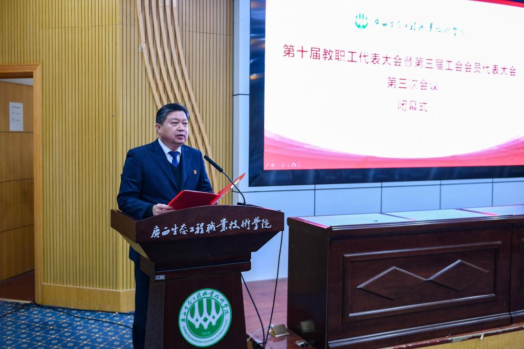 学校党委书记李振秋在大会上作总结讲话,就进一步做好学校工作,提出了三点意见:一是把握发展形势,坚定发展信心,要抓住办学实力和办学水平快速提升的重要战略机遇期,着力打造办学优势和办学特色,努力成为支撑广西生态文明建设、助力全区林业高质量发展的生力军、排头兵;二是加强内涵建设,提升办学实力,要围绕特色鲜明高水平职业院校这个总目标,要保持战略定力,增强斗争精神和本领,向质量提升这个中心聚焦发力,稳步实现奋斗目标;三是团结奋斗,汇聚发展合力,要提高思想认识、转变思维方式,个人目标要主动适应学校这个大目标,形成目标共识,以积极主动的态度去面对、理解、适应高水平职业院校建设的各项新形势、新要求、新任务。
