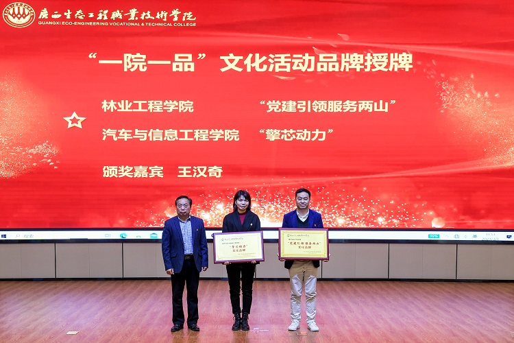 会上为林业工程学院“党建引领服务两山”和汽车与信息工程学院“擎芯动力”两个品牌授予学校第一批校园文化“一院一品”牌匾。
