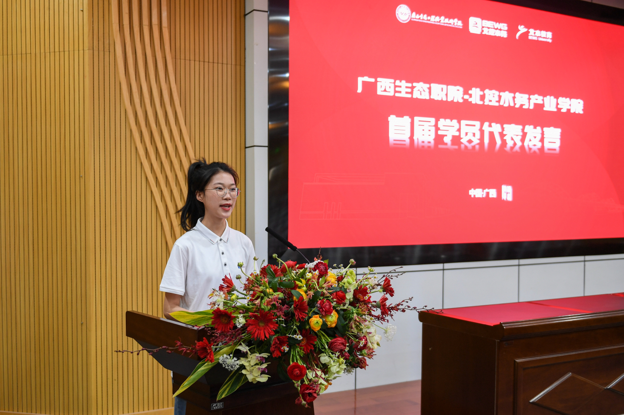 覃国琴在致辞中表示,近年来柳州一直深入践行“绿水青山就是金山银山”理念,坚持走生态优先、绿色发展之路,本次广西生态职院与北控水务集团组建成立产业学院,不仅进一步深化了“政校企行”联动合作模式,更是双方重视生态文明建设和生态环境保护工作,坚持走绿色低碳、高质量发展道路的重要体现。祝愿广西生态职院-北控水务产业学院打造成独具特色、品质一流的高水平教学科研机构和专业人才培养基地,为筑牢南方重要生态屏障、推动全市绿色发展贡献力量!