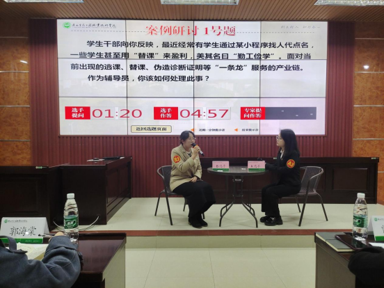 进入决赛的12名选手分别就案例研讨和谈心谈话环节进行现场展示。在案例研讨环节,选手们围绕案例内容,采取轮流提问和回答的形式,针对学生日常管理中的“意识形态教育”“思想困惑”“反诈教育”“危机处置”“心理辅导”“学业辅导”“成长指导”等案例共同辨析原因、研讨对策、总结规律。参赛辅导员们既是对手、又要联手,既要出招、也要接招,在交流研讨中充分展现了分析问题、研判问题、解决问题的能力。