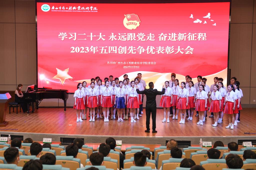 大会在激昂的国歌声中拉开帷幕,韦文榜宣读2022年度五四创先争优表彰文件,学校领导依次为获奖集体及获奖个人颁奖。
