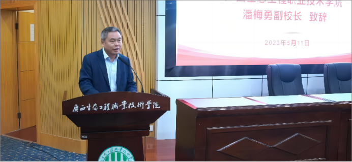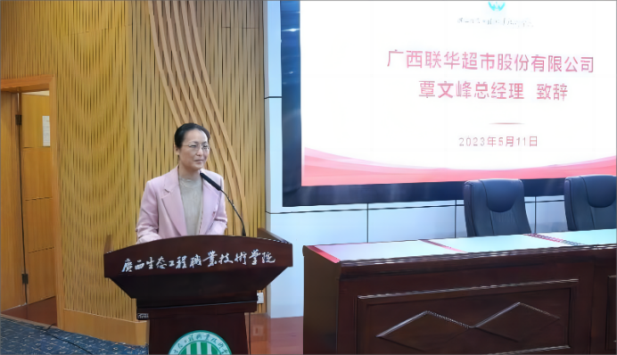 潘梅勇致辞,他感谢广西联华对学校发展的大力支持,他指出,作为中国南方地区领先的连锁超市品牌之一,广西联华超市股份有限公司在零售业领域拥有广泛的影响力和深厚的市场基础,我们将以此次合作为契机,加强校企之间的紧密联系,实现资源共享、优势互补,从而进一步能在技术创新、人才培养、教育科研等领域开展广泛而深入的交流合作,推动校企人才培养模式革新和人才培养质量的提升。