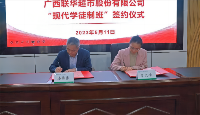 5月11日,pg娱乐与广西联华超市股份有限公司举行校企合作签约暨授牌仪式。学校副校长潘梅勇广西联华超市股份有限公司党总支书记、总经理覃文峰,以及校企双方相关负责人、学校相关专业师生200多人参加活动。