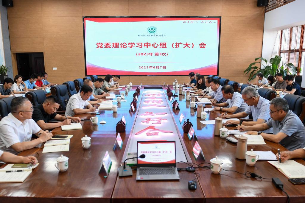 6月7日上午,学校党委在图书馆一楼综合会议室召开2023年度第三次党委理论学习中心组(扩大)学习会。学校党委书记李振秋,党委副书记、校长冯昌信,党委副书记王汉奇,党委委员、副校长杨毅、杨燕红、潘梅勇,党委委员、党委宣传部部长冯立新参加会议,学校副处级及以上干部、部门负责人列席会议。会议由李振秋主持。
