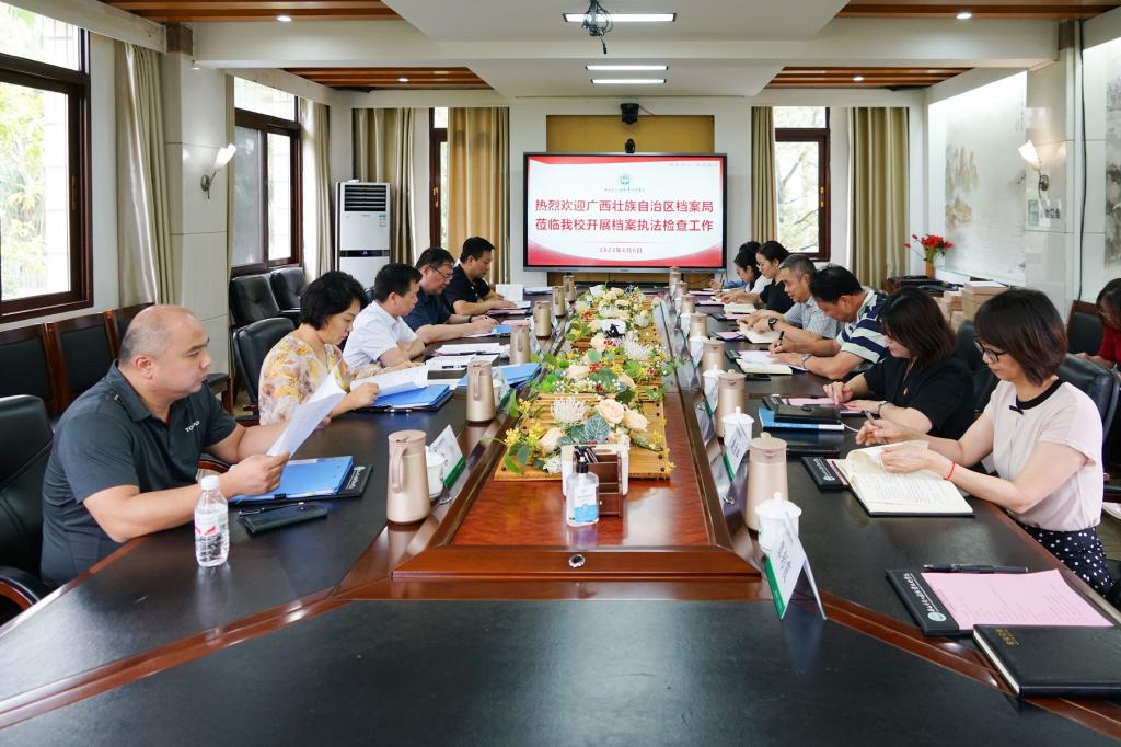 6月6日,自治区档案局检查组组长二级巡视员韦家友一行5人莅临pg娱乐,通过听取汇报、实地检查、查阅资料等方式开展行政执法和档案信息安全工作检查。学校副校长潘梅勇,党政办公室、学生工作处、教务处、后勤管理处、计划财务处等分管档案工作负责人及各部门档案员参会。