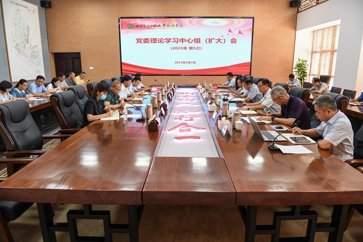 9月7日下午,学校党委在图书馆一棵树会议室召开2023年度第五次党委理论学习中心组(扩大)学习会。学校党委书记李振秋,党委副书记、校长冯昌信,党委副书记王汉奇,党委委员、副校长杨毅,党委委员、副校长杨燕红,校长助理韦文榜,党委委员、组织部部长周全连,党委委员、宣传部部长冯立新,纪委办负责人及学校中层正职领导干部参加会议。会议由李振秋主持。