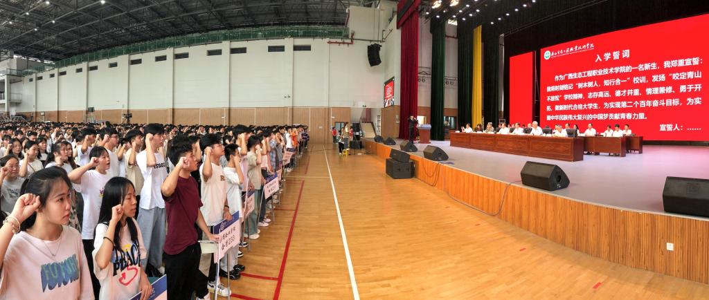 开学典礼最后,全体新生一起宣读入学誓词:将时刻铭记“树木树人,知行合一”校训,发扬“咬定青山不放松”学校精神,志存高远、德才并重、情理兼修、勇于开拓,做新时代合格大学生,为实现第二个百年奋斗目标,为实现中华民族伟大复兴的中国梦贡献青春力量。