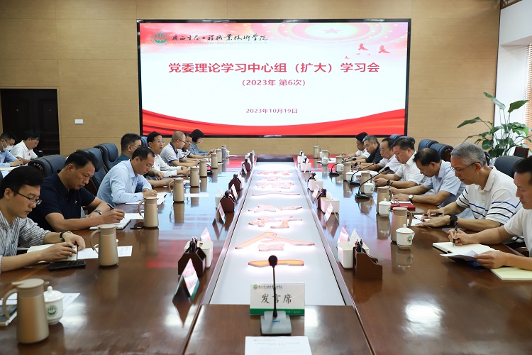 10月19日上午,学校党委在图书馆一棵树会议室召开2023年度第六次党委理论学习中心组(扩大)学习会。学校党委书记李振秋,党委副书记、校长冯昌信,党委副书记王汉奇,党委委员、副校长杨毅,党委委员、副校长潘梅勇,纪委书记许金龙,校长助理韦文榜,党委委员、组织部部长周全连,党委委员、宣传部部长冯立新,纪委办负责人及学校中层正职领导干部参加会议。会议由李振秋主持。