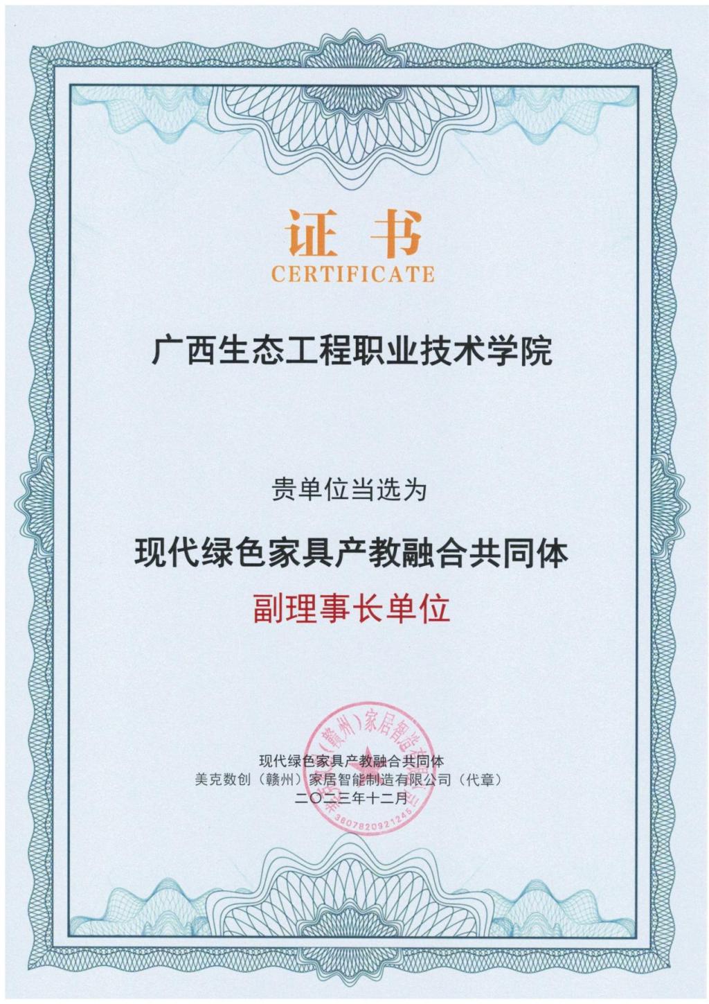 pg娱乐被选为全国现代绿色家具产教融合共同体副理事长单位证书