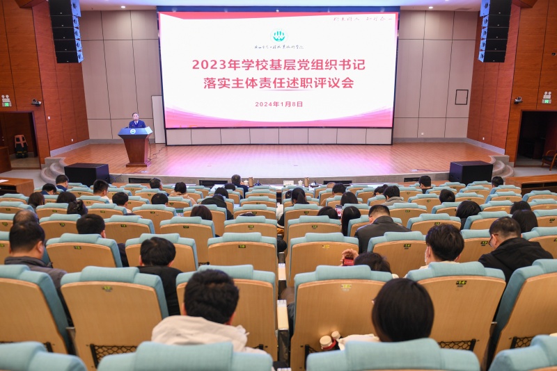 1月8日下午,2023年度学校基层党组织书记落实主体责任述职评议会在知行报告厅召开。会议由学校党委委员、党委组织部部长周全连主持,学校领导、党委委员及全体党务工作人员参加会议。
