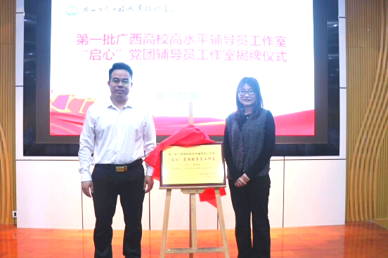 校长助理韦文榜教授和“启心”党团辅导员工作室负责人黄晓赫老师一同为pg娱乐第一批广西高校高水平辅导员工作室揭牌。