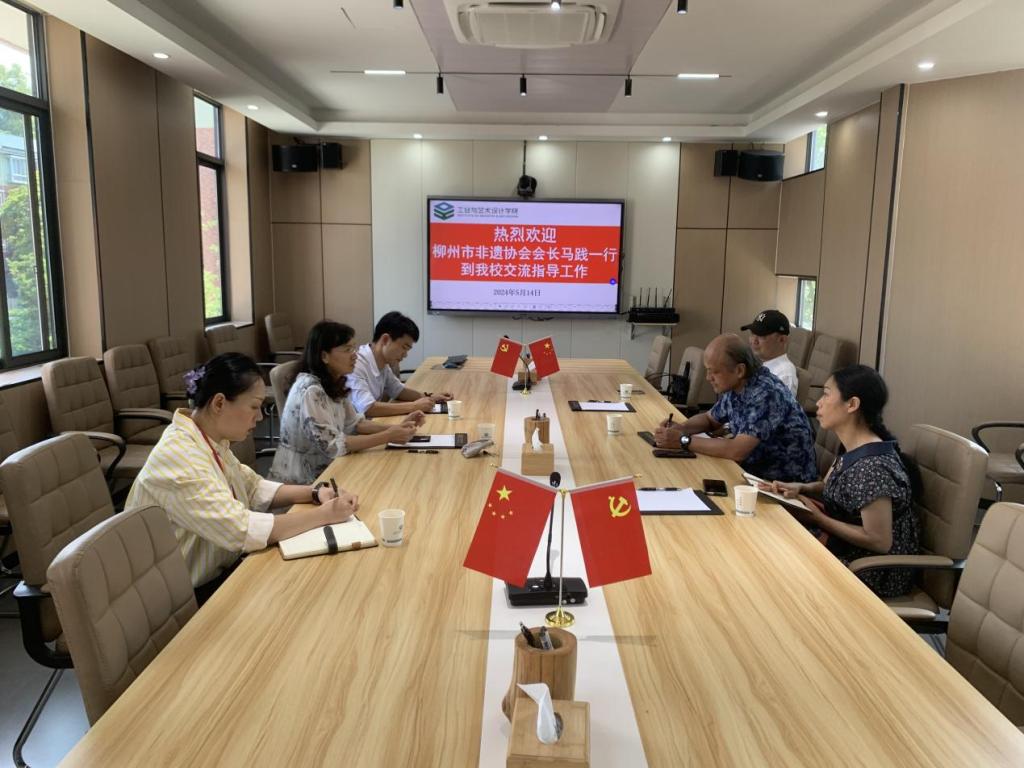 5月14日,柳州市非物质文化遗产保护发展协会会长马践一行3人到pg娱乐工作交流,学校校长韦林、设计学院相关教师陪同出席交流会。