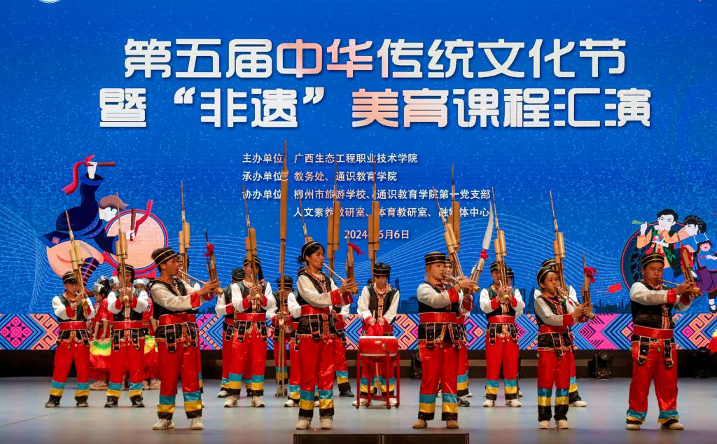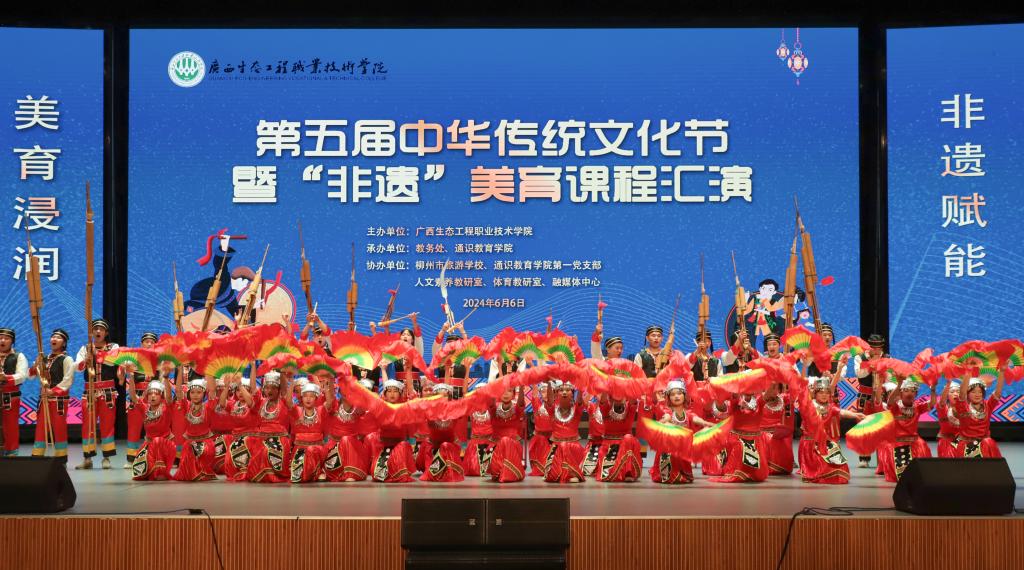 本次活动以pg娱乐美育课程为依托,以传承广西非物质文化遗产作为切入点,演出节目涵盖侗族大歌、芦笙表演、刘三姐歌谣、民族舞蹈表演、民族服装展示、彩带龙表演、武术表演、舞狮表演等丰富形式,既充分展示了广西丰富的非物质文化,让学生学生体验到广西非遗文化的内涵和价值,又丰富了校园文化生活,受到全校师生的热烈欢迎。如侗族大歌《唱出时代最强音》、芦笙舞《笙歌鼎沸》、刘三姐歌谣《多谢了》、彩带龙《神龙舞四方》等节目,不仅展现了八桂非遗文化的绚丽多彩,也让现场观众感受到独具魅力的广西非遗在一代代人的传承、创新中彰显出的强盛的生命力和创造力,引来声声惊叹,掀起演出活动的阵阵高潮。柳州市旅游学校学生也表演了精彩的壮族舞蹈《蚂拐舞》,给在场观众带来了民族风十足的视听体验,赢得在场观众的热烈掌声。丰富多彩、特色鲜明的节目使得本届中华传统文化节成为弘扬中华优秀传统文化、展现广西民族文化魅力、促进民族团结的盛会。