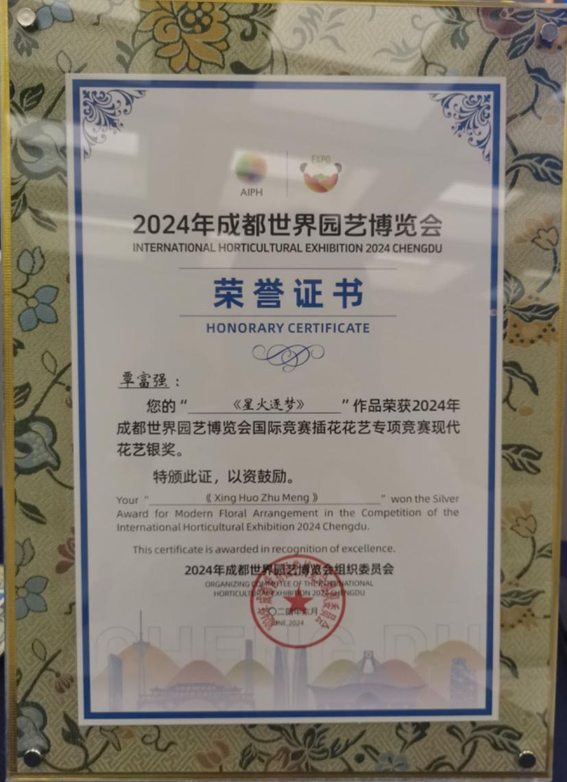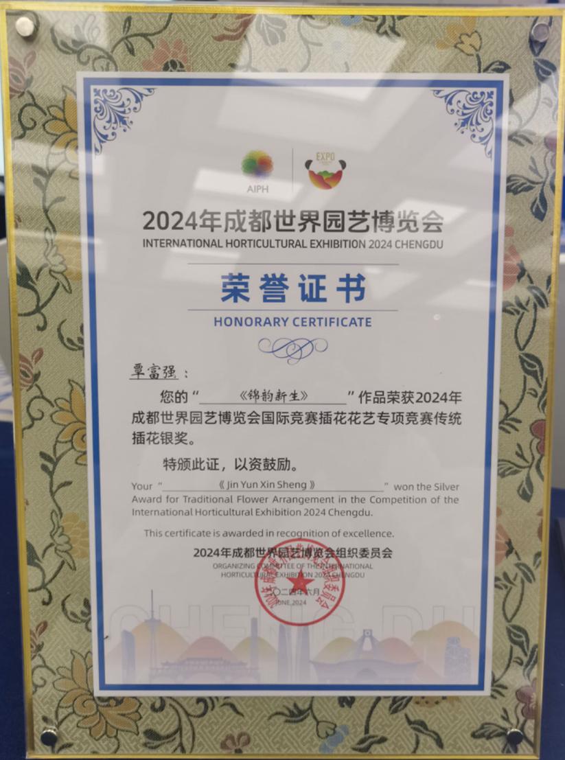 2024年成都世界园艺博览会是经国际园艺生产者协会(AIPH)批准,国家林业和草原局、中国花卉协会共同主办,四川省人民政府、成都市人民政府承办的B类世界园艺博览会。作为成都世园会花卉园艺专项竞赛第四档竞赛,插花花艺专项竞赛设置了“传统插花”和“现代花艺”两个项目,分别以“锦城古韵”和“筑梦未来”为主题。来自日本以及国内18个省(区、市)的50名选手参赛,经过激烈的角逐,pg娱乐选手斩获两项银奖。