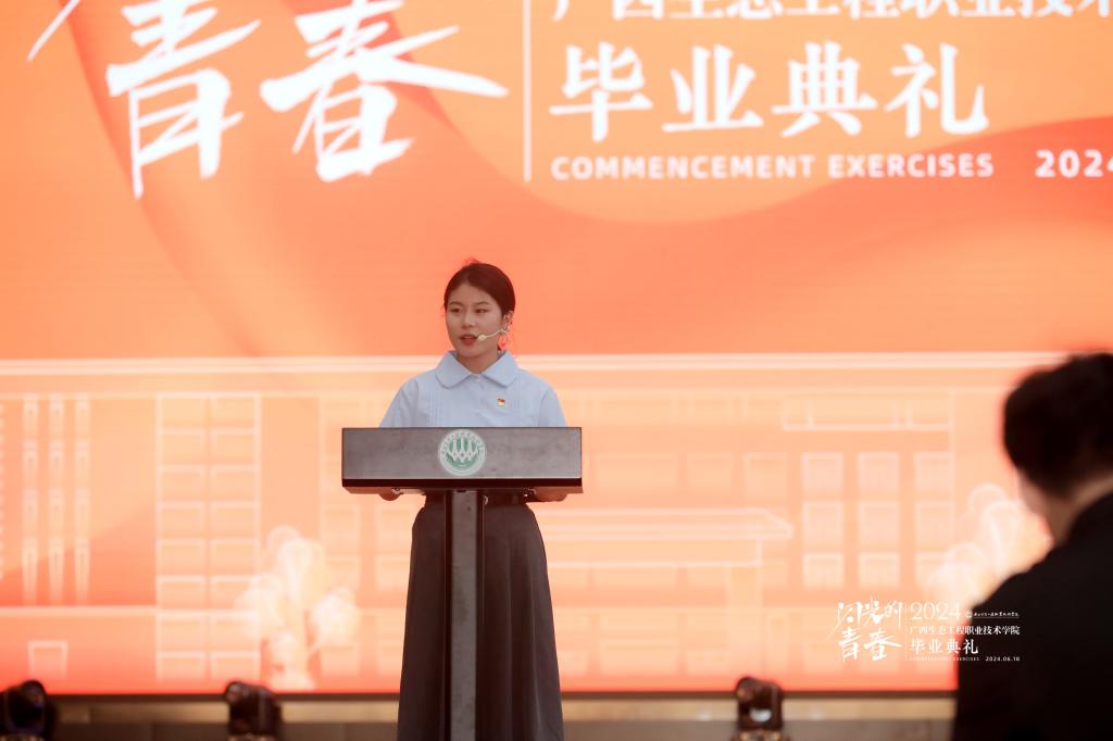 来自旅游与交通管理学院酒店212班的优秀毕业生代表陈曦分享了她在校期间的闪光故事,她动情地说:“大学是一段旅程,它让我们从稚嫩走向成熟;未来则是一片广阔的天空,等待我们去探索、去翱翔。”陈曦带领全体毕业生进行庄严的宣誓,表达了铭记校训、追求卓越的决心。