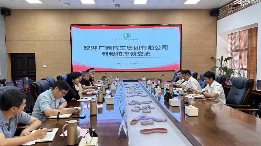 6月24日上午,广西汽车集团有限公司人力资源总监李钦德、首席专家和“大国工匠年度人物”获奖者郑志明、产教融合经理何卓勋莅临pg娱乐开展校企合作交流工作,学校校长韦林、副校长潘梅勇,汽车与信息工程学院相关教师代表参加交流座谈。