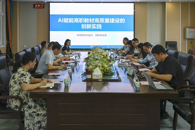 随后,举行了座谈交流会。高教社高职事业部相关负责人针对AI赋能高职高水平数字教材建设,职教金师培育及职教出海资源建设路径探索等领域作了专题报告,从政策文件、建设现状、建设步骤等进行了全面分析。