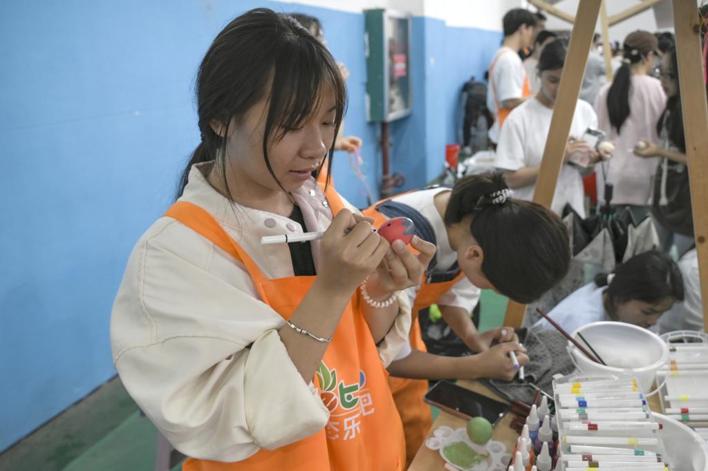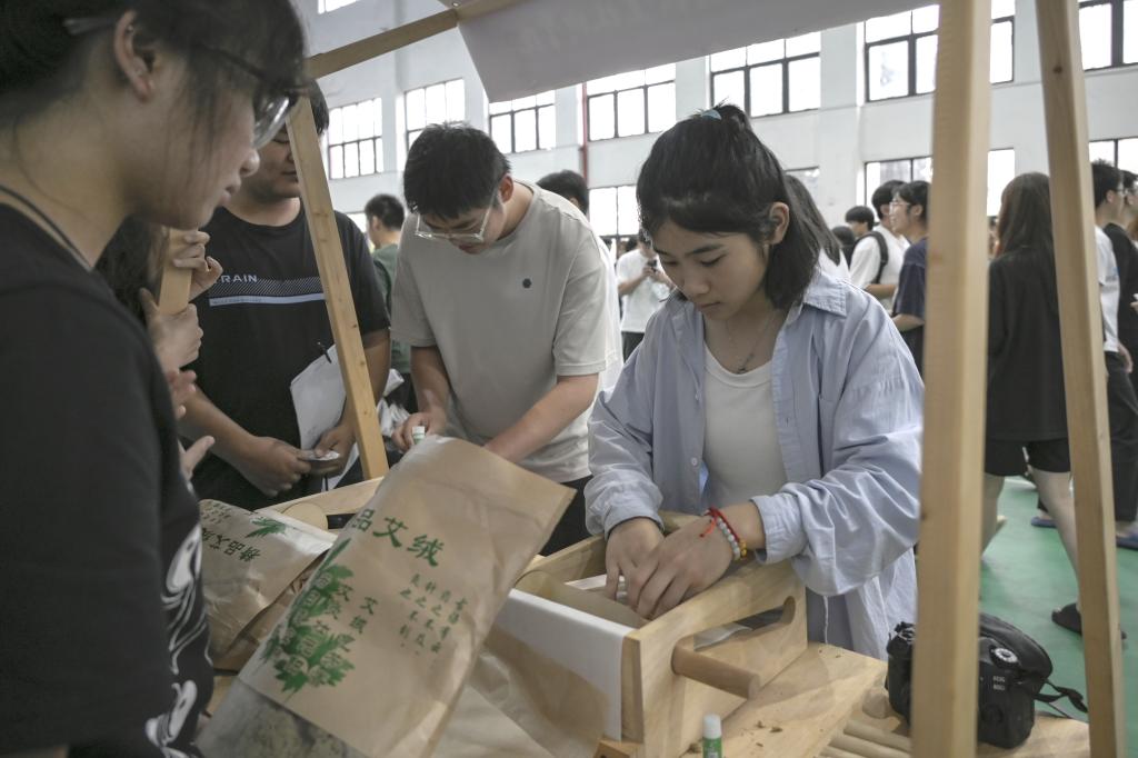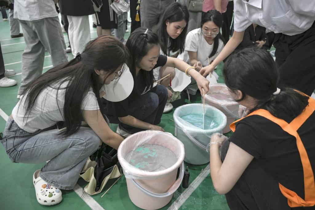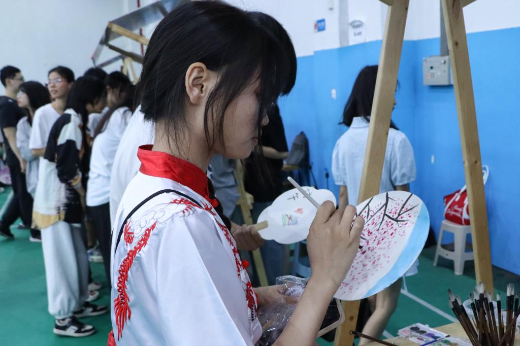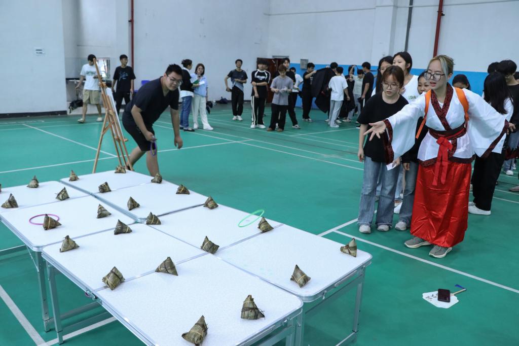 开幕式后,端午民俗体验活动在文化艺术中心广场火热开展。旱地划龙舟比赛点燃师生热情,呐喊助威声此起彼伏;汉服打卡区化身国风摄影棚,衣袖轻扬间尽显传统服饰之美;香囊DIY、大漆扇绘制、画五彩蛋、端午主题设计作品展等活动区域前排起长队,艾草清香与创意色彩交织成趣;包粽子、套粽子、制艾条体验区欢声笑语,师生在劳动实践中品味端午习俗背后的文化意蕴。活动现场气氛热烈,参与人数达上千余人,师生在体验活动中感受中华传统文化的独特魅力与深厚底蕴,增强文化自信。