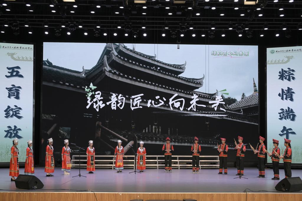 活动在开幕式中拉开帷幕,节目表演精彩纷呈,表演内容涵盖侗族琵琶歌、彩带龙表演、诗歌朗诵、中英弹唱、歌曲合唱等丰富形式,如侗族琵琶歌《绿韵匠心向未来》以婉转旋律传递民族魅力;朗诵《端午的呼唤》以铿锵之声唤起文化自信;师生合作的古筝弹唱《英文版青花瓷》创新融合中西文化元素,展现传统艺术的国际表达;《彩带龙·武韵》表演刚柔并济,展现传统技艺的蓬勃生机;压轴节目合唱《上下求索》气势恢宏,唱响屈原精神的时代回响。开幕式现场掌声雷动,师生在艺术与文化的共振中感悟中华文明的深厚底蕴。
