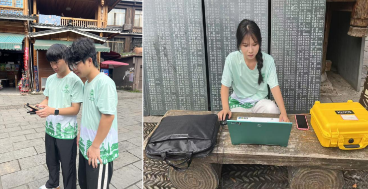 在程阳八寨的鼓楼前,团队展示了无人机+激光雷达扫描采集建筑数据的“黑科技”。随着学生遥控无人机升空,设备以每秒百万点的速度采集鼓楼数据,屏幕上实时生成的三维点云如同建筑的“数字孪生体”。 学生们一边记录老人口述的修复口诀,一边在电脑里校准数据,让传统经验与现代技术相互印证。此次扫描将为这座代表性建筑建立高精度数字档案,为后续保护提供科学支撑。