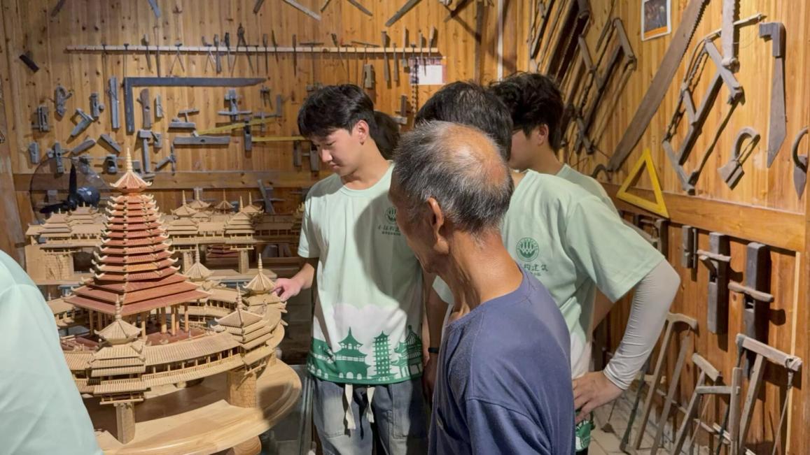 团队首先走进程阳八寨侗族木构建筑民间博物馆。这座藏身于古寨中的专业展馆,陈列着穿斗式民居木架模型、榫卯节点分解模型和鼓楼建造场景微缩景观,从柱、穿、枋的连接逻辑到整座建筑的起架原理,系统展现了侗族木构建筑“不用一钉一铆”的营造智慧。中华木作大师杨恒金给实践团介绍木构建筑营造工,展柜里,鱼形墨斗、楠竹杖杆等传统工具与激光扫描生成的三维点云图并置,老木匠用的曲尺与学生携带的全站仪形成奇妙对话。