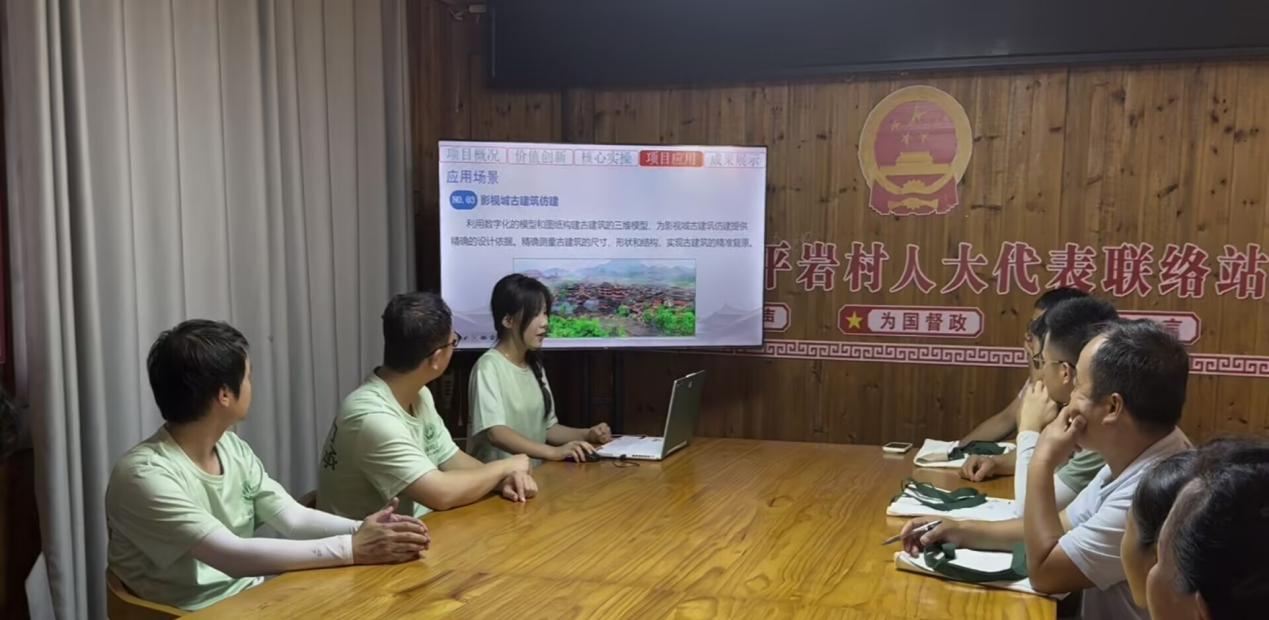8月2日,团队与当地村委会在新时代文明实践中心召开座谈会。“村里三座鼓楼面临木材腐朽问题,年轻人不愿学老手艺,修复难啊!”村委主任杨军胜的发言道出困境。带队教师张方晖介绍无人机+激光雷达的新技术,为木构建筑保护与传承提供更多可能。双方就“数字档案+工匠修复”的合作模式达成共识,通过三维模型开发文旅小程序,让更多人在线体验鼓楼建造过程。此次座谈为校地长效合作奠定基础,助力形成“科技保护+文化传承”的良性循环。