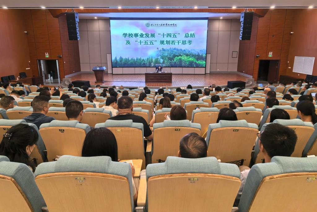 学校校长韦林作“学校事业发展‘十四五’总结及‘十五五’规划若干思考”专题报告。报告系统梳理学校“十四五”期间在办学条件、办学特色、人才培养、国际交流等方面的突出成就—— 校园面积扩增74.96%,建成3个自治区B类高水平专业群,学生获自治区级以上竞赛奖项1000余项,应届毕业生就业率连续21年保持90%以上。明确“十五五”期间“建设特色鲜明全国一流高水平职业院校”的总目标,提出 “14510”发展战略,围绕专业建设、教师能力提升、科研服务等十大工程部署重点任务。