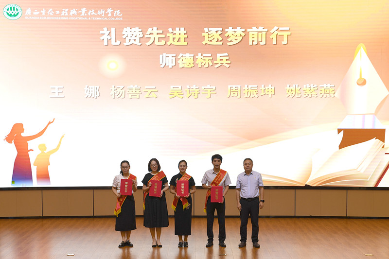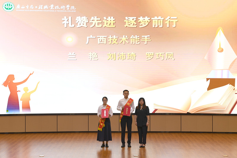 在“礼赞先进·逐梦前行”表彰环节,学校对2024年度广西技术能手、第五届师德标兵、2025年优秀教师、优秀教育工作者、优秀师徒等先进个人进行了表彰。特别对指导学生获得世界职业院校技能大赛、广西职业院校技能大赛等重要赛事奖项的指导教师给予高度认可。教师代表吴诗宇、李丽娜、彭洪君分别发言,分享育人心得与竞赛指导经验,展现了生态教师队伍的政治素养、业务能力和奉献精神。