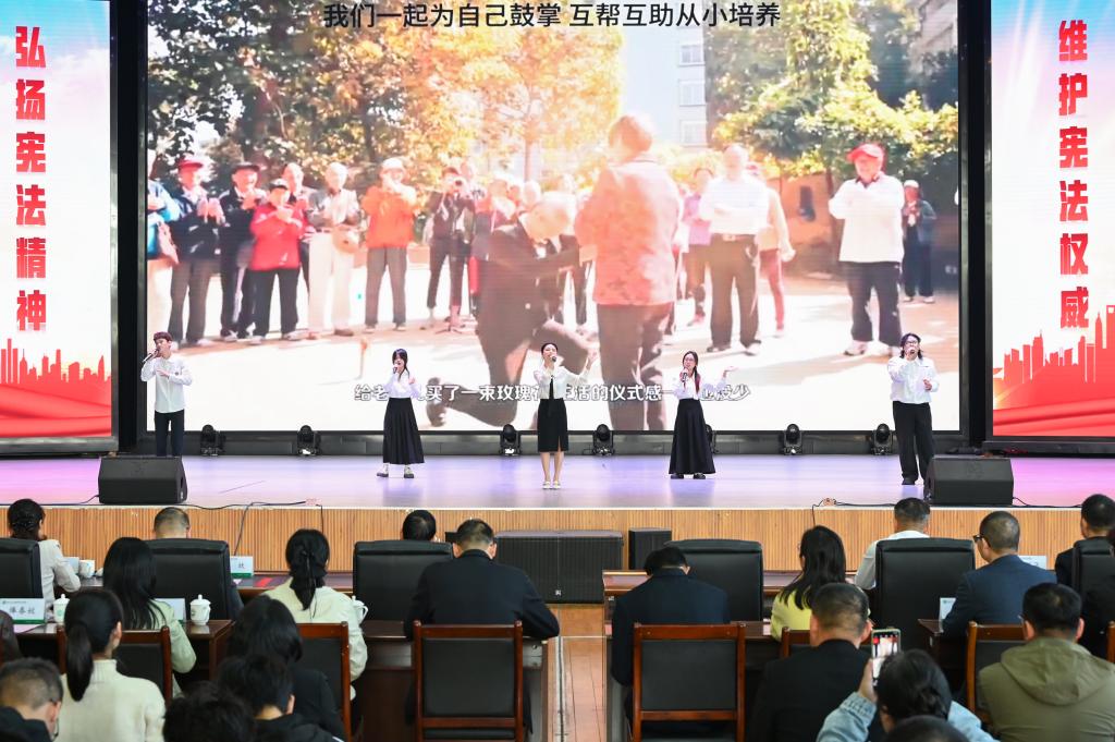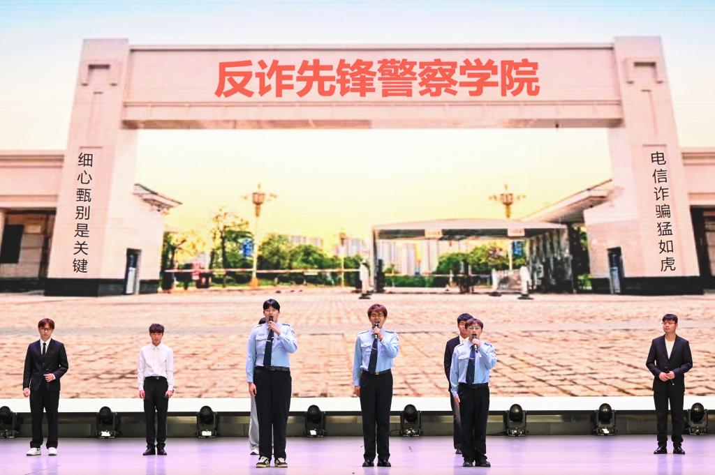 为让宪法精神贴近青年学生,学校依托 “法律协会”“学生艺术团”,策划系列 “沉浸式” 教学成果展演,用青春视角解读宪法内涵。师生合唱《宪法伴我们成长》将宪法庄严与青春活力融合,让宪法不再是冰冷的条文,而是陪伴青春成长的 “灯塔”,引发全场共鸣。诗朗诵《以宪法为翼,赴青春之约》以 “青年与宪法”为主题,将“生态保护”“乡村振兴”等时代命题融入其中,“当我们在林间监测生态,宪法是守护绿水青山的准则;当我们在田间推广技术,宪法是保障农民权益的盾牌”,真挚的情感引发全场共鸣。最引人入胜的当属情景剧《反诈风云》。学生们通过幽默风趣的方式还原生活中的电信诈骗案例,剖析年轻人常见的法律风险,讲述身边的宪法知识,极大提高了大家的反诈意识。