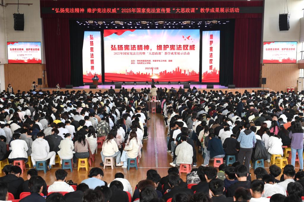 为深入学习贯彻习近平法治思想,推动“八五”普法规划圆满收官,将宪法精神与思政育人深度融合,12月2日下午,学校在文化艺术中心举办2025年国家宪法宣传暨“大思政课”教学成果展示交流活。学校党委书记冯昌信教授,河池市中级人民法院高级法官、全国先进工作者、全国五一劳动奖章获得者潘嘉芳,广西国有三门江林场、柳州市司法局、中共柳州市委党校、广西汇力律师事务所、广西启泽律师事务所、广西甲天下律师事务所、柳州市仲裁委员会、柳州市法律援助中心等单位嘉宾,学校2000余名师生现场参与。