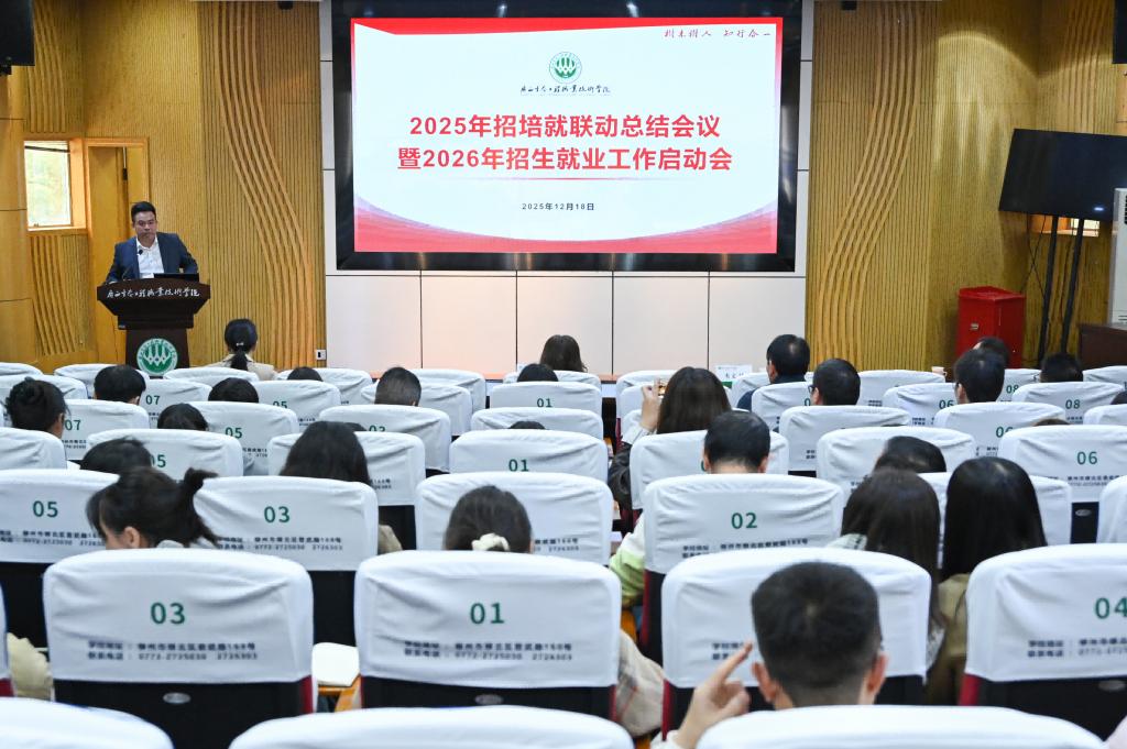 会上,校长助理韦文榜对2026年招生就业创业工作进行布置。他强调,要提高政治站位,坚持问题导向、目标导向、结果导向,聚焦关键环节,紧扣招生与就业协同并进主线,打开格局,真正构建起“招培就联动、育用人贯通”的可持续发展生态。