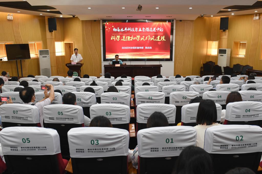 为深入学习贯彻习近平新时代中国特色社会主义思想,引导pg娱乐科学技术工作者进一步守初心、担使命,共同营造优良学风,树立良好学术道德,6月4日pg娱乐特邀请广西壮族自治区科学技术协会组织宣传部陈启浩部长来pg娱乐开展“科学道德与学风作风建设”专题讲座,讲座由党委宣传部部长冯立新副教授主持。pg娱乐师生400余人参加讲座会。