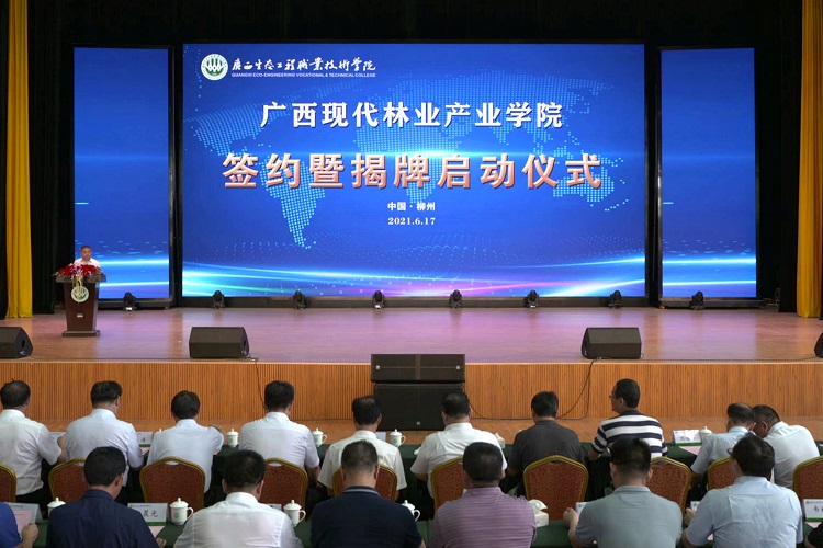 6月17日下午签约暨揭牌启动仪式在学校大学生活动中心隆重举行。自治区林业局,柳州市北部生态新区,柳州市教育局,柳州市林业和园林局,自治区林业局办公室、区直国有林场和林业企业等领导出席启动仪式,学校领导班子成员,各部门、二级学院负责人及师生代表参加启动仪式,会议由学校副校长潘梅勇主持。